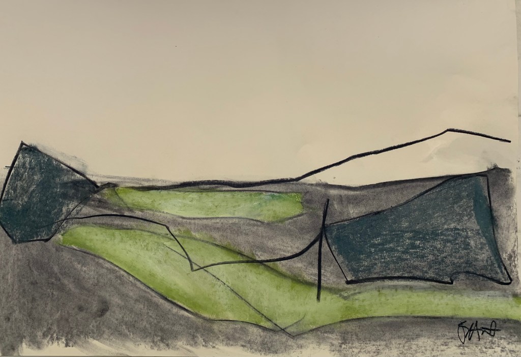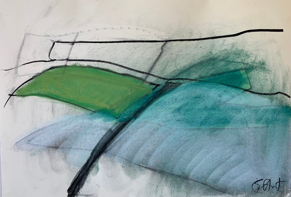 exciting semi-abstract paintings in pastel and charcoal.